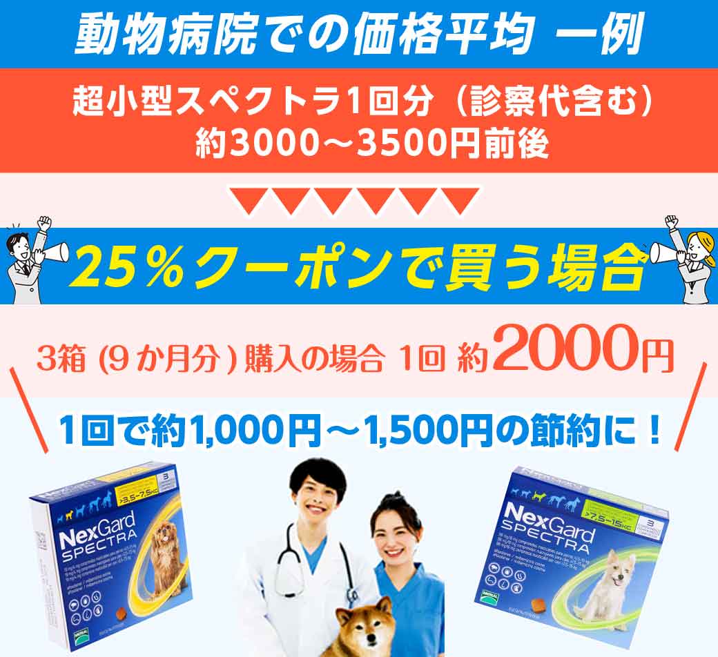 動物病院と、通販でのネクスガードスペクトラを比較すると上記のような形式となります。